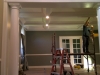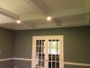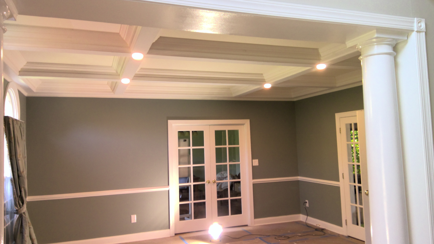 This coffered ceiling project was designed to create 9 coffers with (4) 4in LED recess lights installed in the intersection of the beams. To build this project, we first installed our blocking with glue and nails. Next we install the beams, which are joined together with a 1/4 in splice glued and installed into a slot that we cut with our router. We then install a 3 1/2 in inverted base board moulding and 4 1/2 in crown moulding to create each coffer. Coffered ceilings can be done in a variety of sizes and layouts. A coffered ceiling designed with many smaller coffers will create a more intimate feel in a room that can work well in certain spaces. This architectural element has been used for centuries, and can add great detail to just about any room in your house.